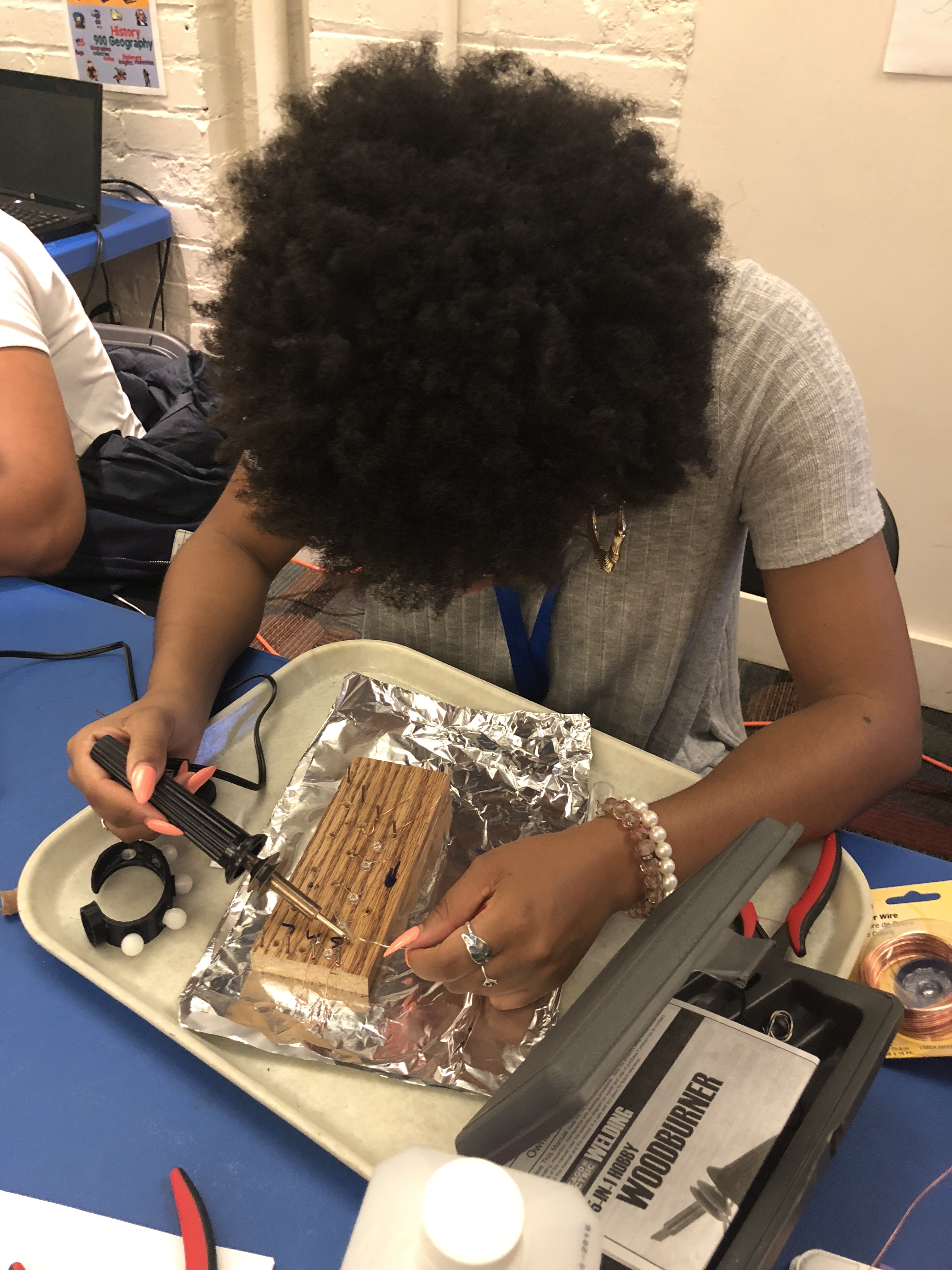 As a masters student research intern this summer, I’ve been looking at how girls’ participation in the CompuGirls program contributes to their perceptions of self-efficacy, which is defined as the belief in one’s ability to successfully accomplish a task. I think the most striking example of girl’s self-efficacy expansion I observed occurred at the Ypsilanti District Library in an activity where the girls used soldering to add circuitry and blinking LEDs to a 3d printed bracelet. Soldering is the process by which you use an extremely hot metal implement to weld two pieces of metal together. It’s no joke. The girls were intimidated at first and I certainly can’t blame them — so was I! But as they gained exposure to the tools and began soldering on their own under the safety and supervision of experienced teachers, they really took to the activity and each one of them successfully finished a bracelet. Their confidence and feelings of self-efficacy soared, with many of them reporting that learning to solder was the highlight of their day and several going on to make additional projects using soldering in the final days of the camp.